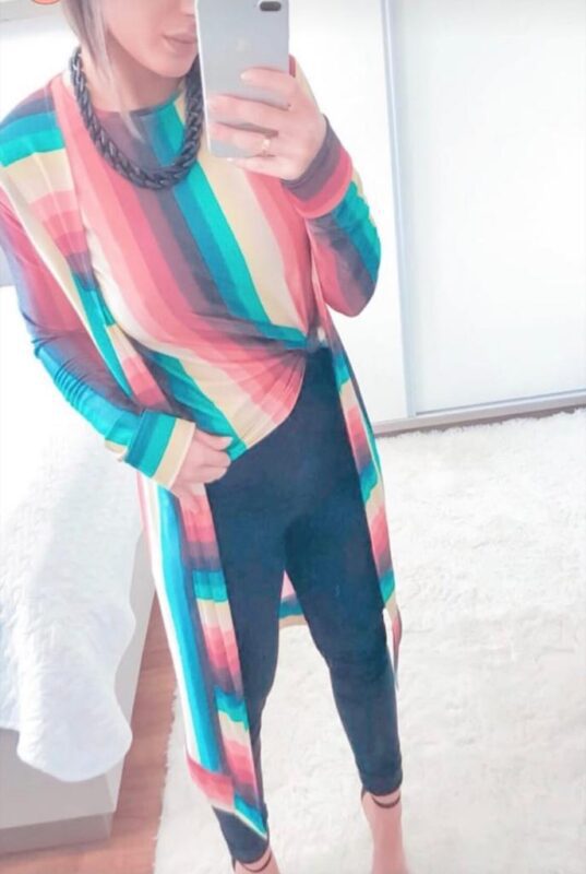 Conjunto de kimono + t-shirt em tecido malharia listrada.