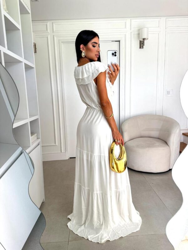 Vestido longo ombro a ombro com detalhe babados, em tecido plano.