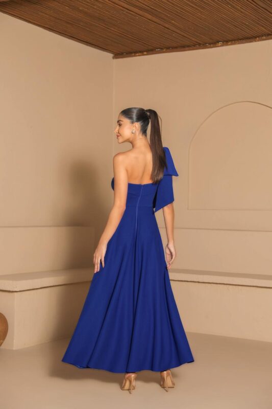 Vestido midi um ombro so com laço, saia godê e ziper nas costas em tecido scuba crepe.