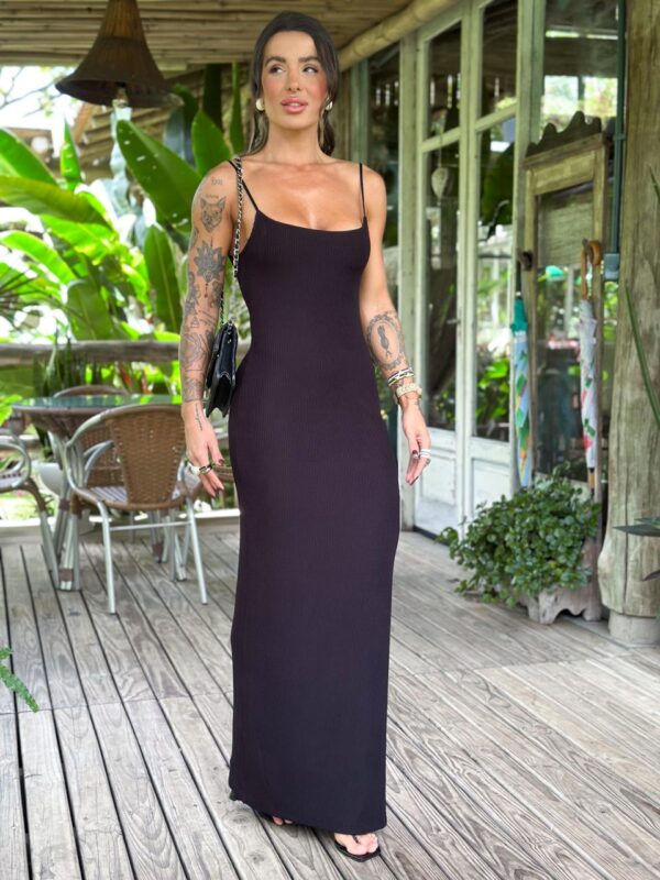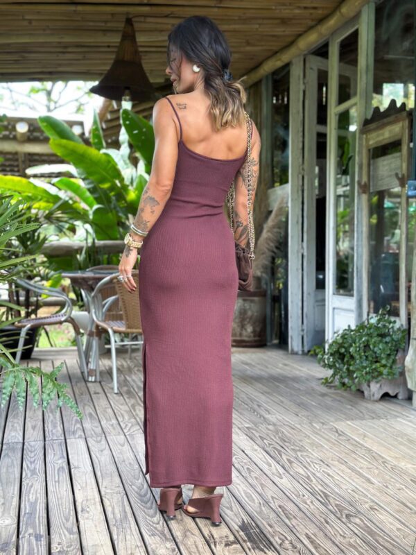 Vestido midi forrado alça com fenda na parte de trás, em tecido canelado com elastano.