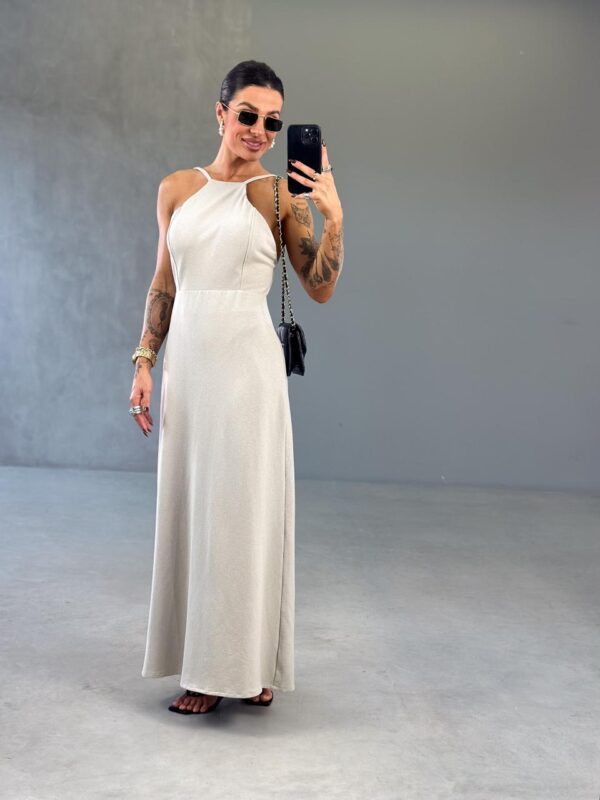 Vestido longo frente única com detalhe abertura nas costas e ziper, em tecido alfaiataria.