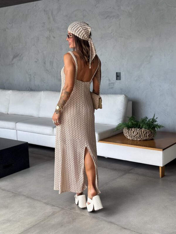 Vestido super midi com alças, forrado e detalhe fenda na parte de trás, em tecido malha de crochê. Acompanha lenço no mesmo tecido.