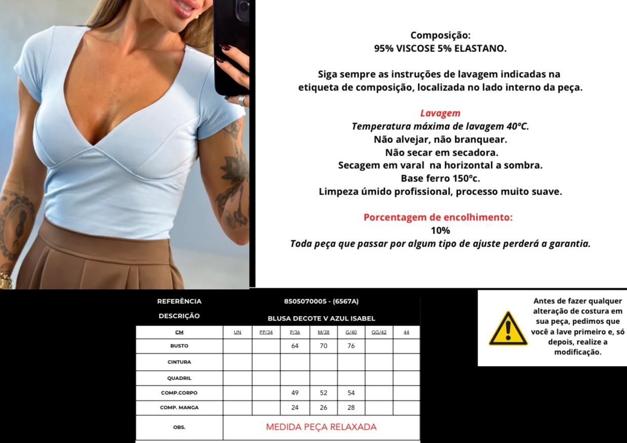 Blusa manga curta com detalhe recorte na parte do busto e decote em v, em tecido malha ribana.