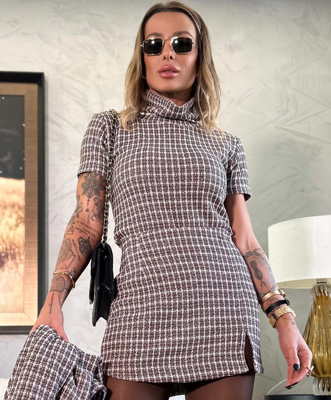 Blusa estilo t-shirt com gola média em tecido tweed mesclado marrom e off white com fio prateado.