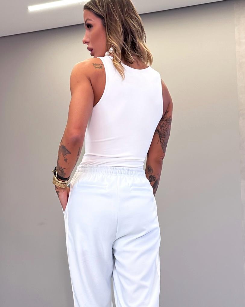 Body básico estilo regata, com tecido duplo na parte dos seios e fecho pressão na parte de baixo, em tecido malharia com elastano.