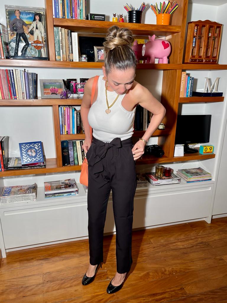 Calça clochard alfaiataria com faixa no mesmo tecido.