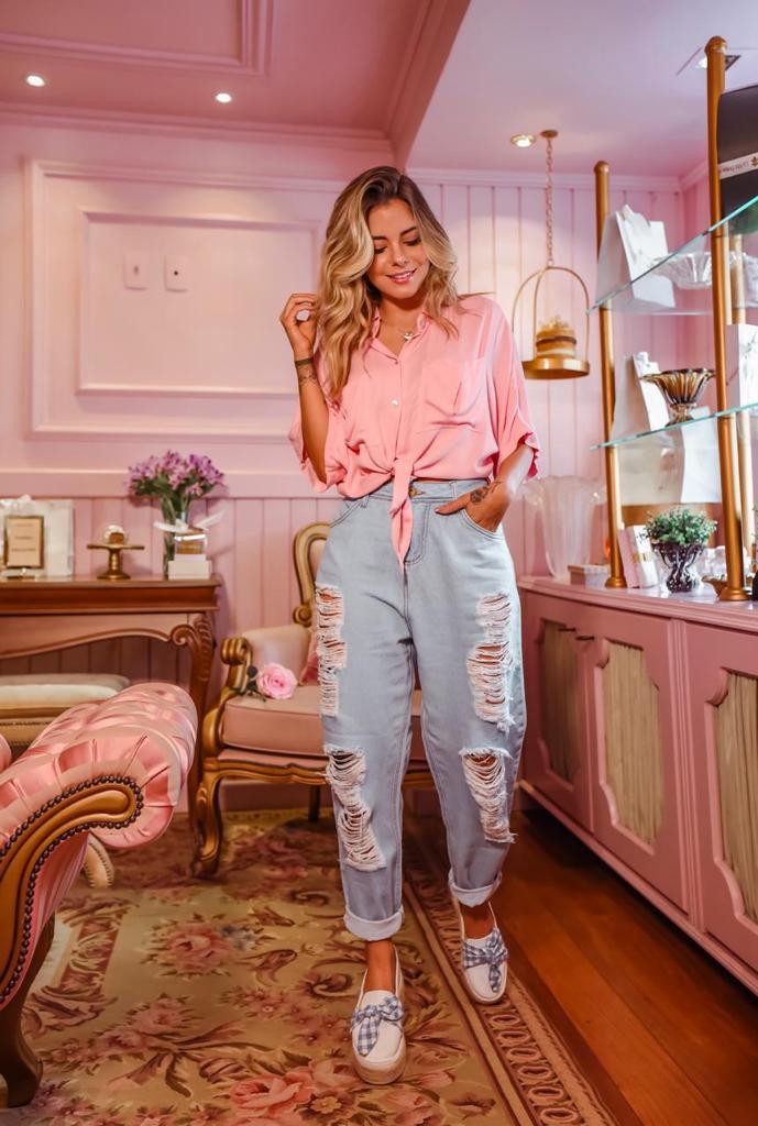 Calça jeans claro estilo boy estilizada.
