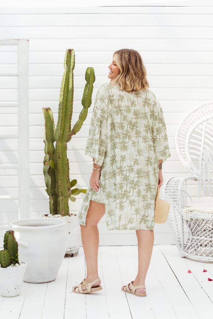 Kimono aberto e fendas nas laterais, em tecido viscose e estampa coqueiros.