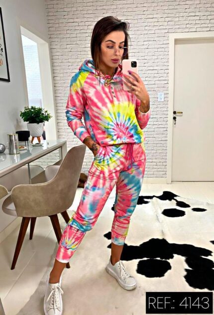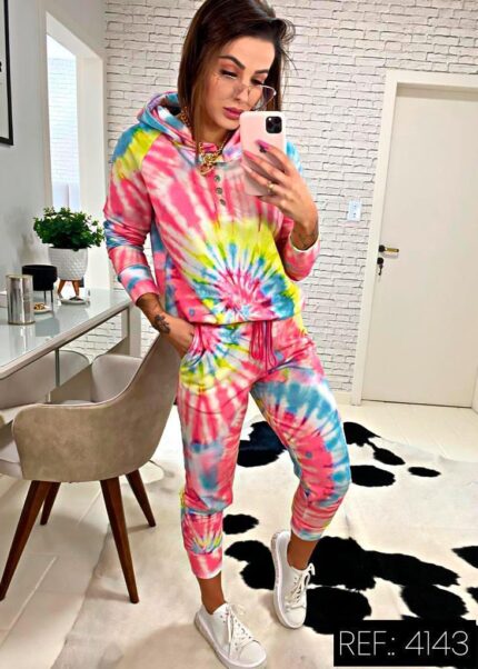 Conjunto de calça e casaco em tecido moletom com brilho.