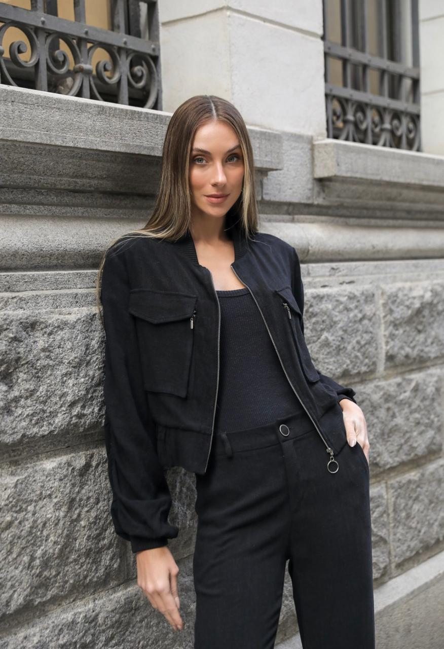 Conjunto composto por calça estilo pantalona com bolsos na frente e elástico na parte de trás e jaqueta bomber com detalhe elástico no punho e na cintura e ziper na frente em tecido viscolinho soft.