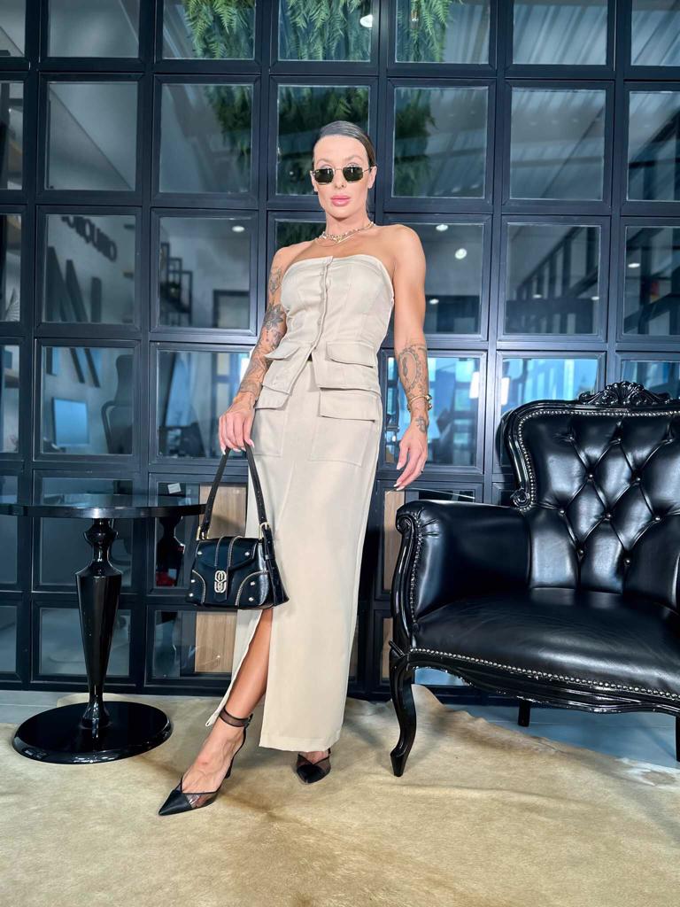 Conjunto composto por saia super midi alfaiataria com bolsos e abertura na frente e blusa tomara que caia com lapela, fechamento na frente em botões e lastex nas costas, em tecido plano.