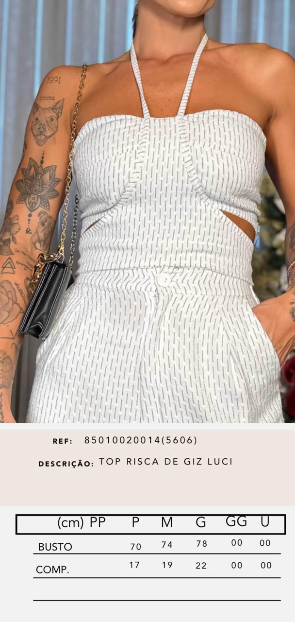 Conjunto composto por bermuda com elástico na parte de trás da cintura e top com detalhe abertura e amarração, em tecido plano com estampa risca de giz.