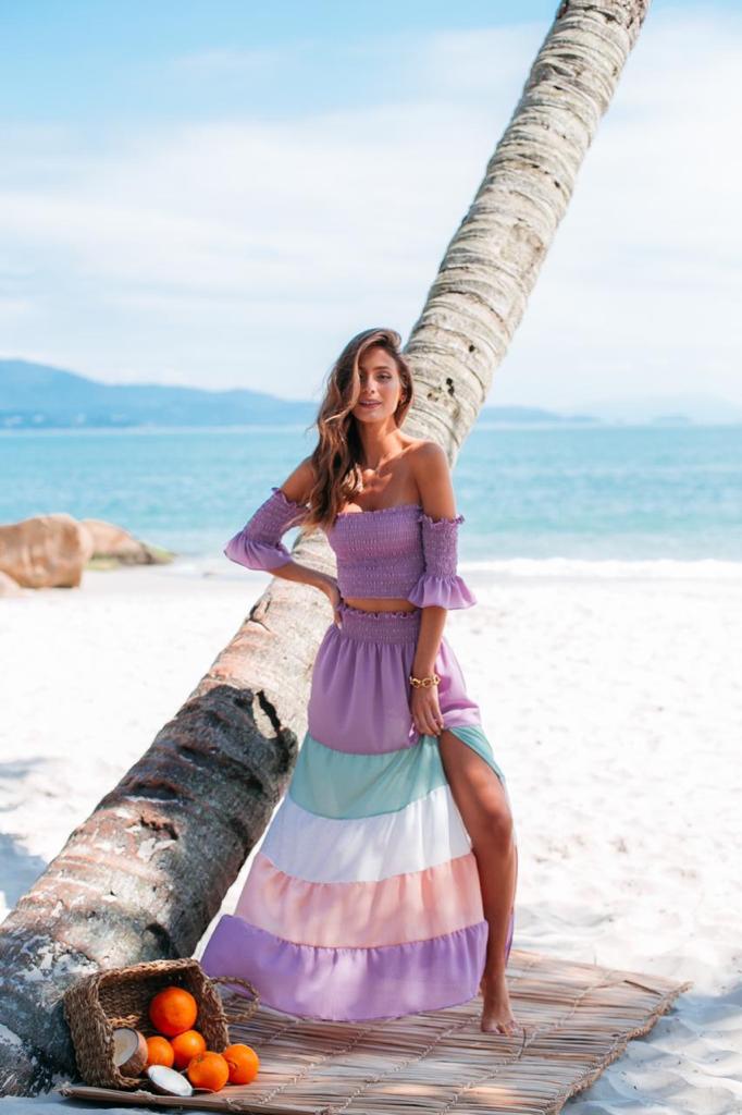 Conjunto de saia longa com fenda frontal e top ombro a ombro com lastex em tecido crepe.