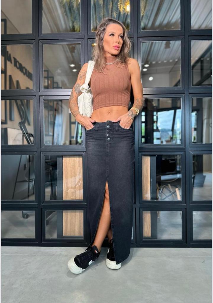 Cropped estilo regata com gola alta em tecido canelado com toque aveludado.