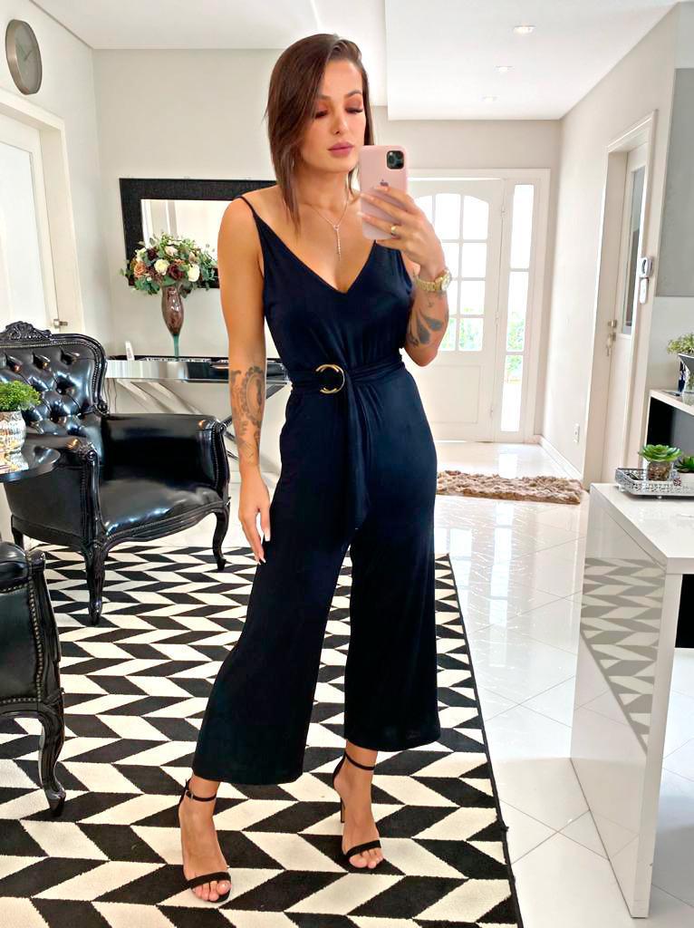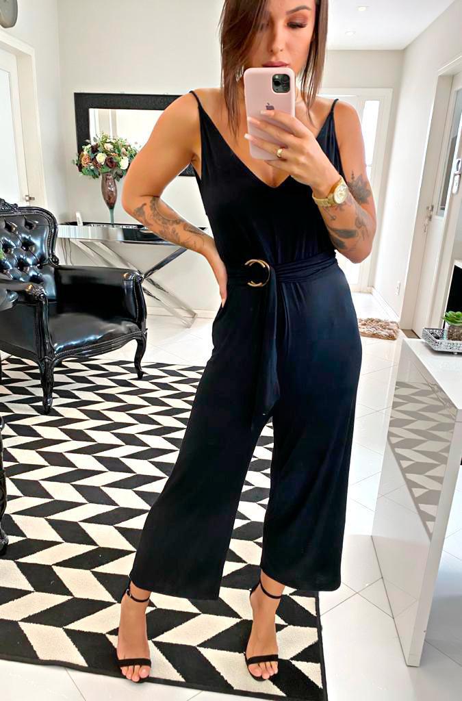 Macacão pantacourt em tecido viscose com elastano de gramatura bem leve e fluída. Acompanha cinto do mesmo tecido e cor.