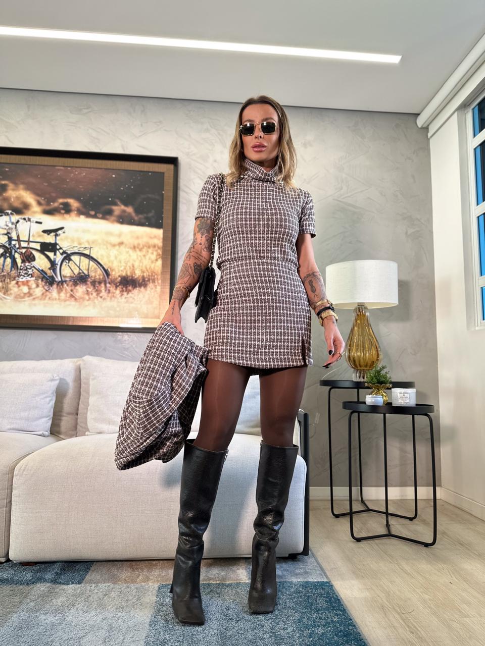 Saia curta com detalhe mini fenda frontal e elástico na cintura em tecido tweed mesclado marrom e off white com fio prateado.