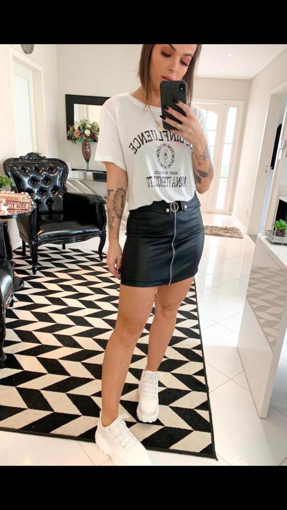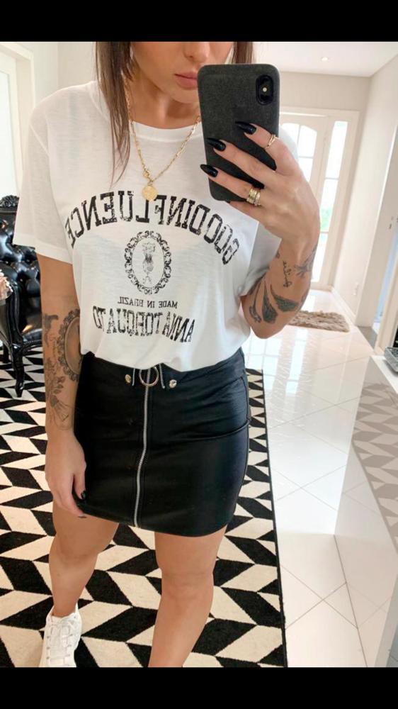 T-shirt gola redonda com frase em silk “GOOD INFLUENCE – MADE IN BRASIL ANNA TORQUATO”.