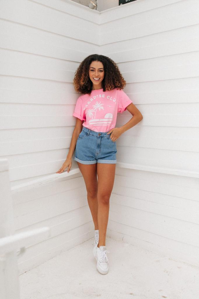 T-shirt estilo boyfriend 100% algodão com frase “PARADISE CLUB TURQUOISE BAY, AUSTRALIA”.