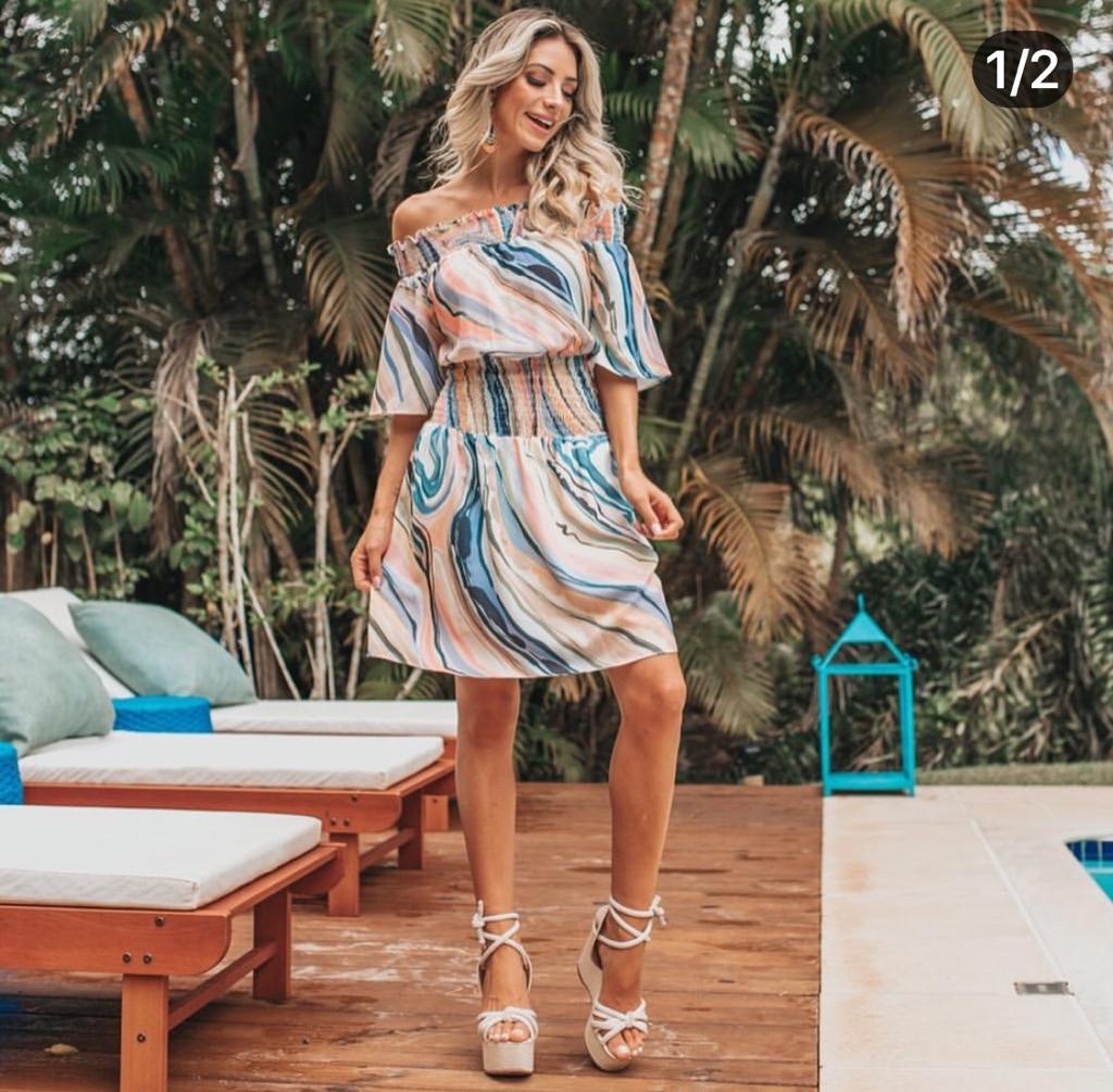 Vestido curto ombro a ombro com lastex na cintura e estampa marmorizada.